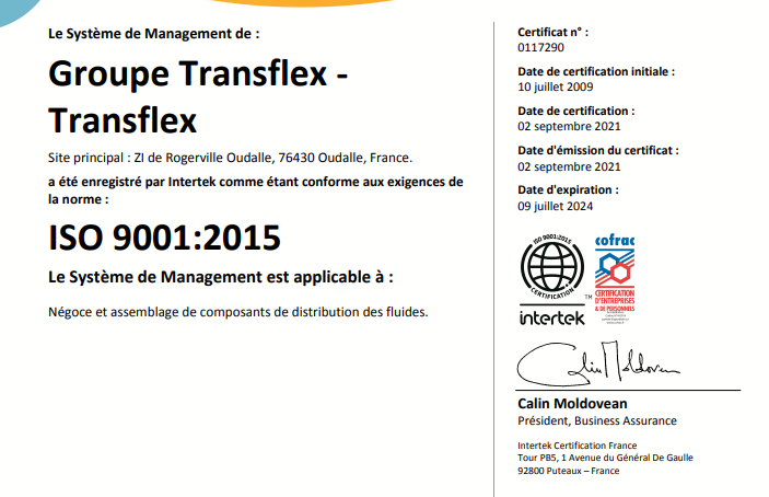 - CERTIFICAT ISO 9001 TRANSFLEX ROGERVILLE 0191509_FRA_07-27 Notre activité requiert également qu’une partie de notre gamme de produit soit agréé par le Bureau Véritas Marine :
